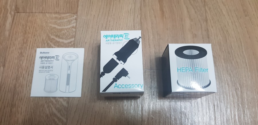 개봉하면 공기청정기, 헤파 필터, 어댑터 이렇게 있어요. 충전해서 사용하는 방식은 아닙니다.