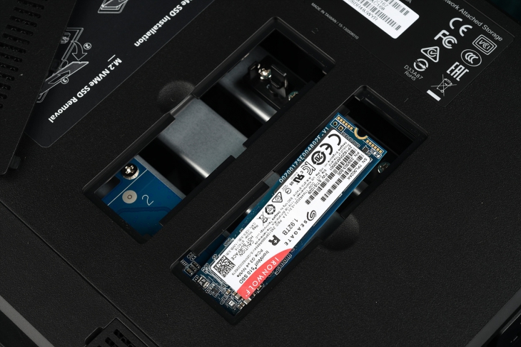 그래서 DS920+ 를 보다 쾌적하게 사용하기 위해서는 2가지 추가적인 하드웨어 추가를 해주면 좋은데 우선 첫번째는 스토리지, 즉 디스크에 붙여서 캐시를 사용할 수 있는 2개의 M.2 2280 NVMe SSD를 연결해 주는 것이다. 이 부분은 앞선 기사를 통해 소개했는데 DS920+ 의 바닥면에 가이드를 통해 최대 2개까지 설치가 가능하다.