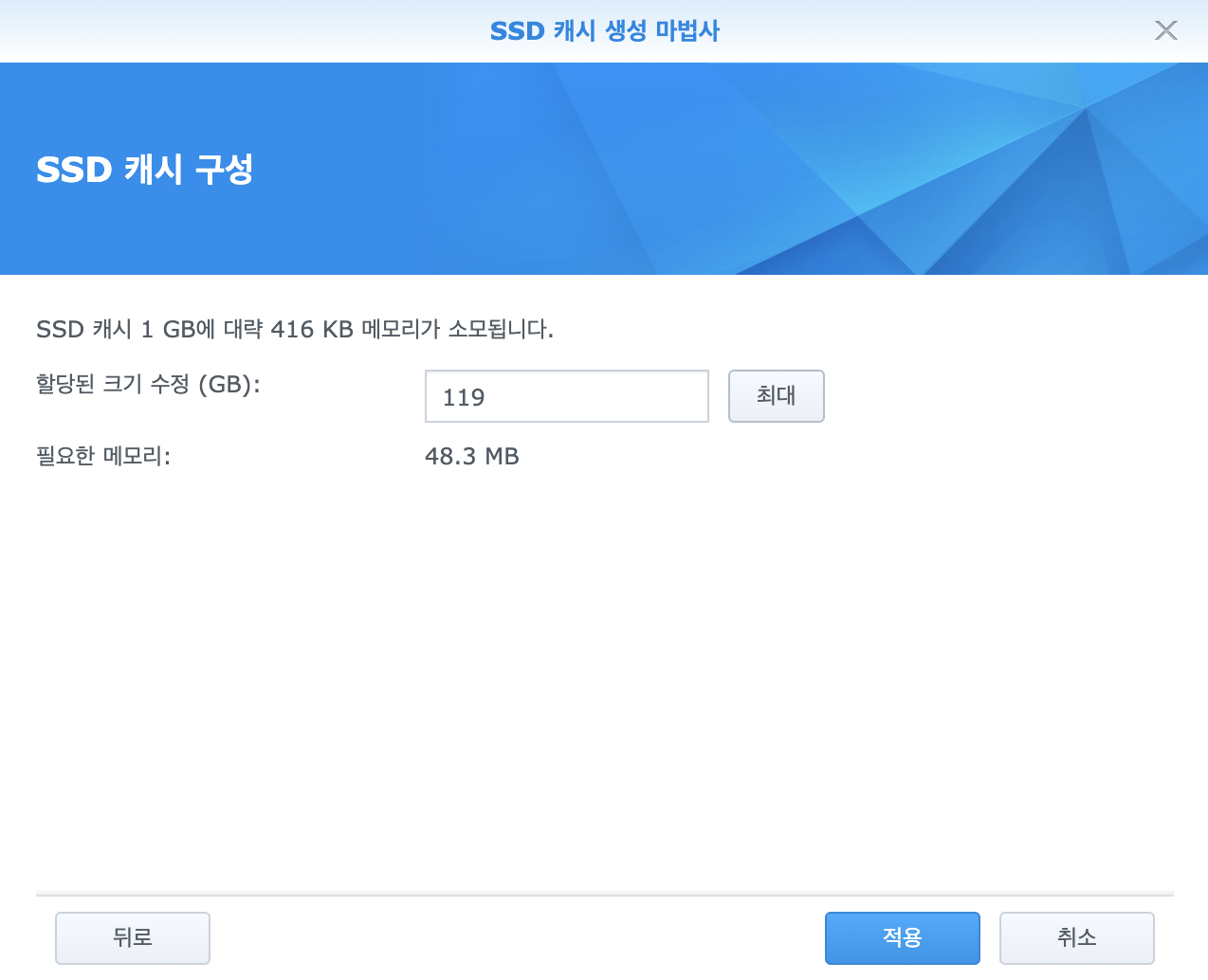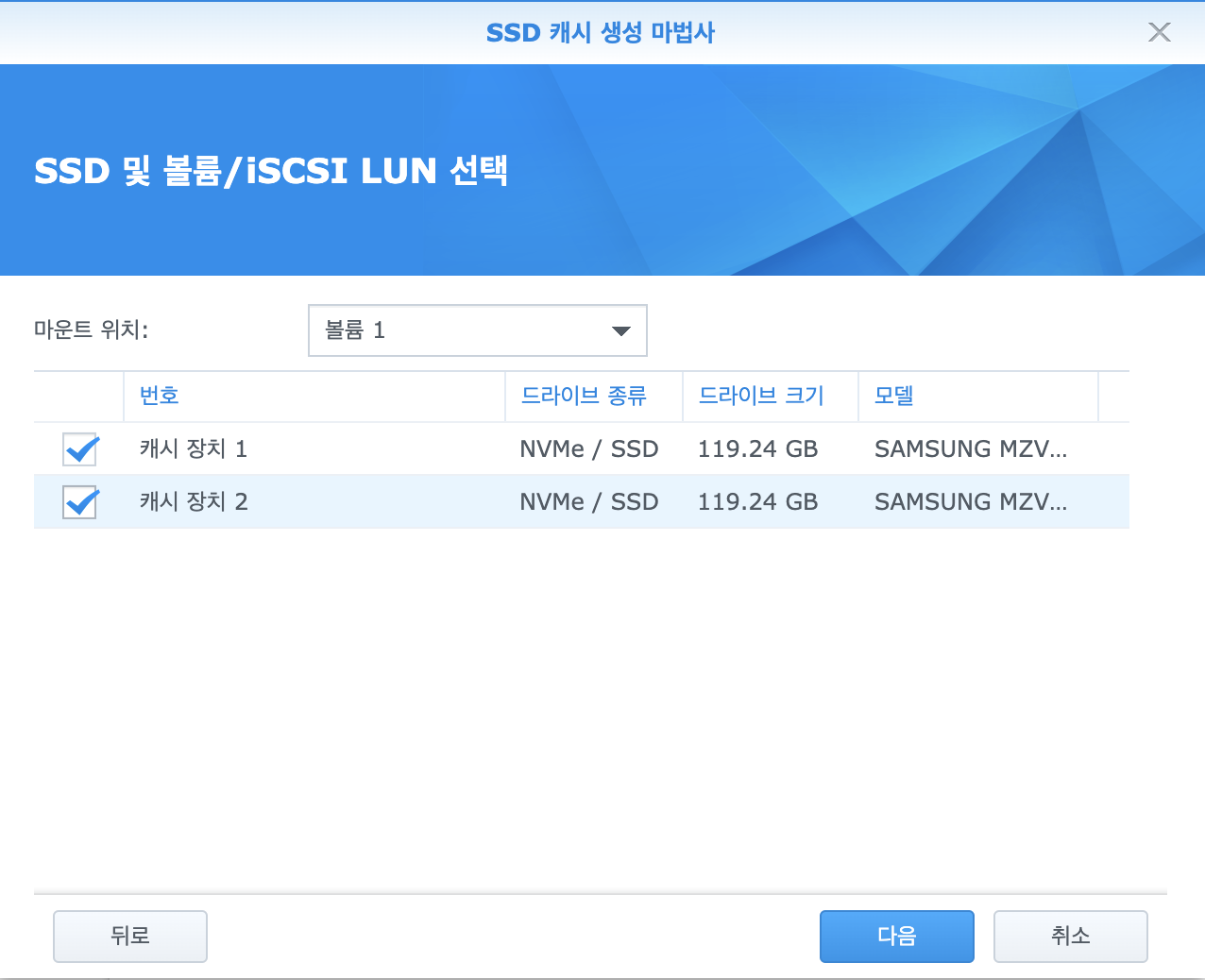 어떤 볼륨에 대한 캐시로 활용할 것인지를 선택할 수 있습니다. 저는 패키지 등이 설치 된 볼륨 1로 일단 그냥 잡아봅니다.