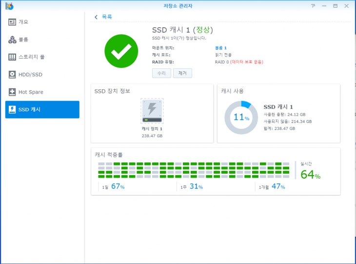 지금은 NAS사용 초기라 그런지 캐시 적중률이 항상 높네요. 일단 하고 나니 확실히 빨라지는 것이 느껴지네요. 전문가의 결론은 아래와 같습니다만