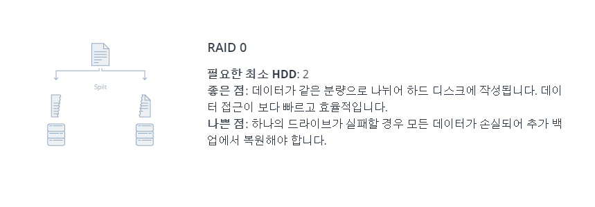 가장 퍼포먼스에 좋은 구성이나 안정성에선 가장 떨어짐. 개인목적 사용에도 비추함. 이유는 데이터 접근이 빠르고 효율적인것은 인터넷 속도와도 연관되어서 체감하기가 굉장히 어렵기 때문. 결국 모든 HDD를 하나인 것 처럼 쓰는 것인데 한개라도 문제 생기면 데이터 전부 날라감.