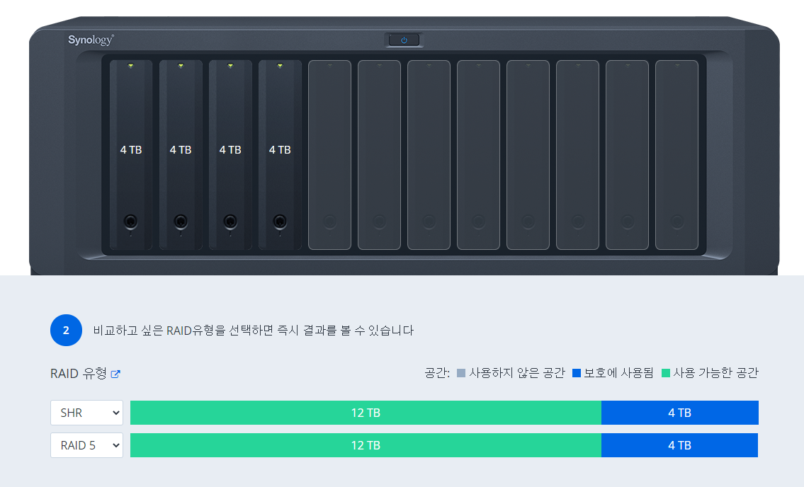 레이드 구성 시뮬레이션 해보기: https://www.synology.com/ko-kr/support/RAID_calculator?hdds=