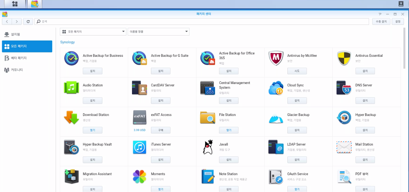 DSM에서 위 이미지를 누르시면 패키지를 다운 받을 수 있는 마켓(?) 을 접속할 수 있습니다.