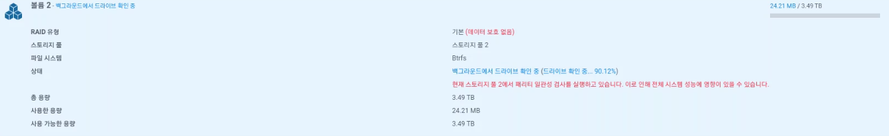 이런식으로 스토리지 검사를 하고 있다고 뜨는데 이게 4테라 기준 거의 6시간 정도 걸립니다. (더 걸릴 수도)