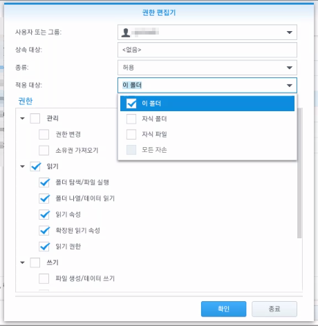 여기에서 원하는 권한을 주면 됩니다. 읽기, 쓰기 뿐만 아니라 특정한 액션까지 세부적으로 권한을 주고 싶으시면 사용자 지정에서 선택하시는게 좋습니다. 그리고 하위폴더와 권한을 주고 싶으시면