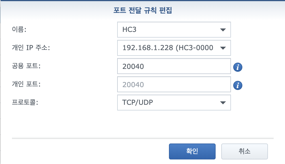- Network: 네트워크 연결 관련 설정입니다. 외부 접속을 원하시면 포트포워딩을 해주시면 됩니다. 예를 들어 공유기 포트포워딩 메뉴에서 가상의 포트 하나를 만드시고 외부포트를 80으로 연결하시면 됩니다. 저의 경우 아래와 같이 설정했습니다.