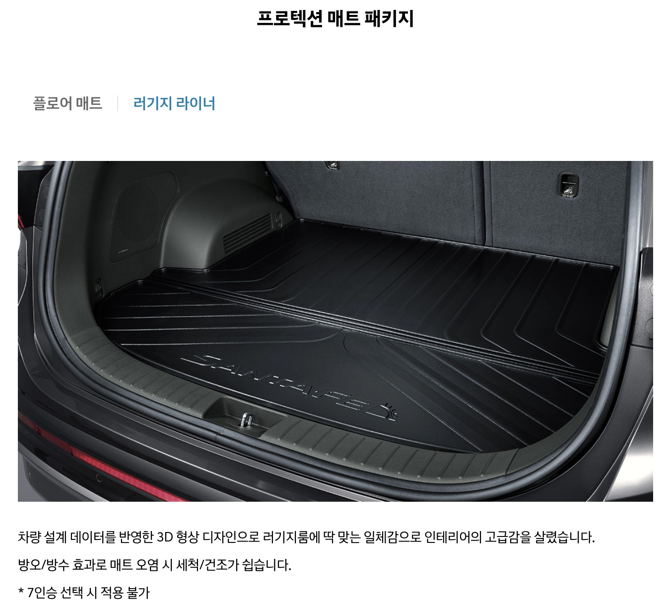 프로텍션 매트 패키지는 실제로 받아보니 팰리세이드의 그것과 소재가 다르더군요. 팰리새이드는 정말 짱짱한 무광 우레탄인데 산타페꺼는 앞열은 팰리새이드와 같은 재질이나 트렁크 쪽은 약간 싼티나는 유광 고무입니다. 사진으로는 무광느낌이 났는데 실제로는 아니네요. 이 부분이 약간 아쉽긴 하지만 우레탄 시트는 애프터 마켓에 없기 때문에 나름 만족 합니다.