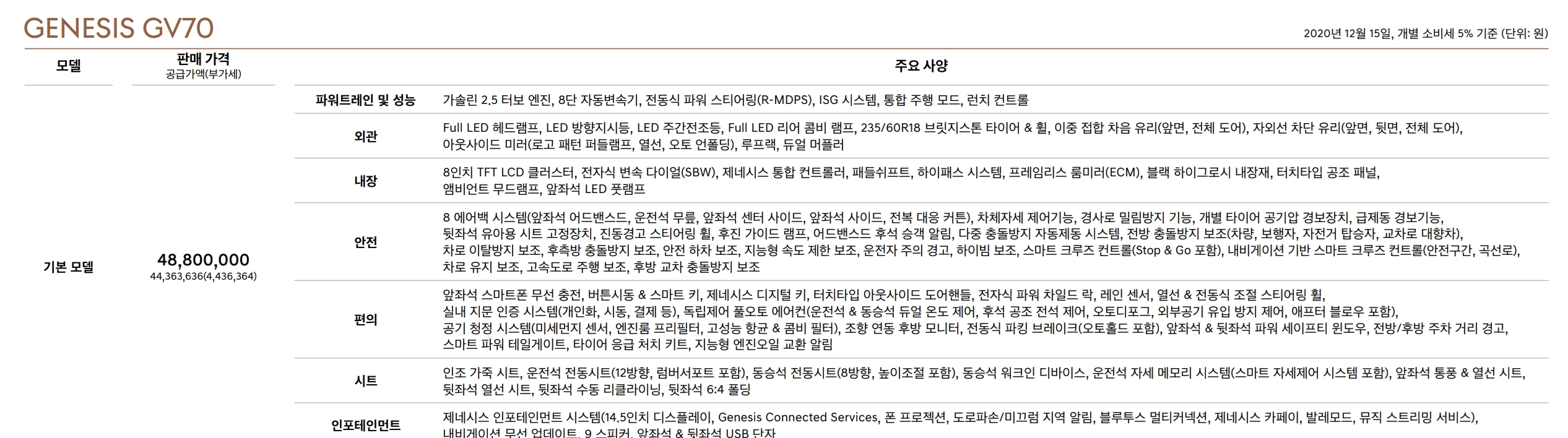 드디어 제네시스 GV70 가격표가 나왔네요.