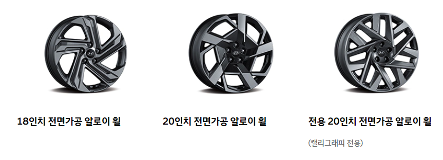 우선 프레스티지에서 디자인 플러스 옵션을 선택하시게 되면 18인치 휠에서 20인치 전면가공 알로이 휠로 변경됩니다. 개인적으로 20인치 휠은 18인치 휠보다도 디자인이 별론거 같아요. 역시 캘리그라피 전용 휠이 디자인은 가장 이쁘구요.