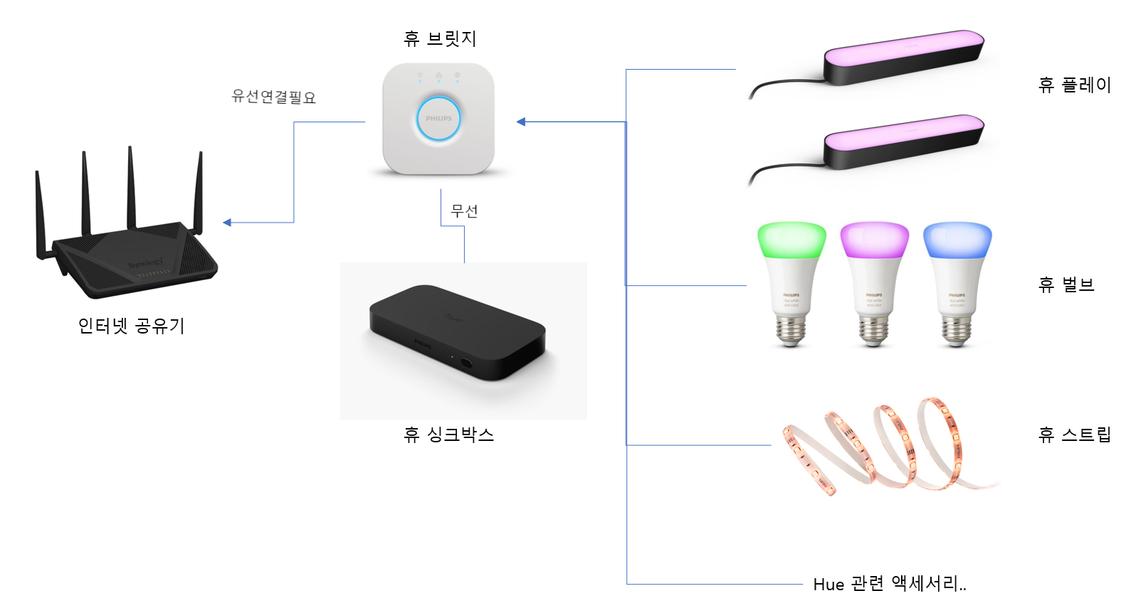 I. 필립스 휴 브릿지 설치 싱크박스를 사용하기 위해서는 우선 브릿지를 설치해야 합니다. 브릿지 설치는 매우 간단합니다. 브릿지에 동봉된 랜 케이블을 공유기에 유선 연결하고 전원 케이블을