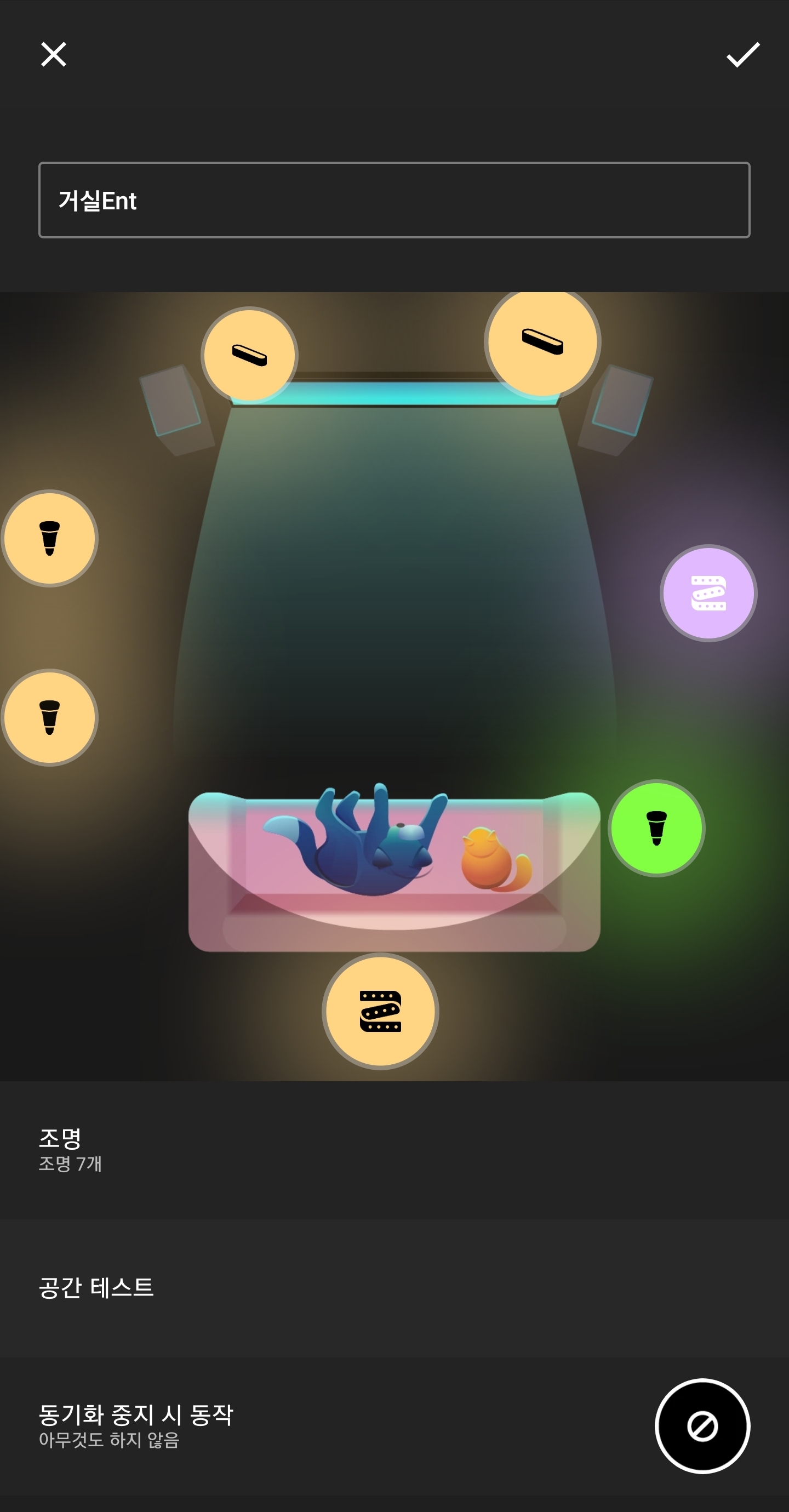 엔터테인먼트 공간만들기를 실행하시면 이 공간에 어떤 조명들로 구성할 것인지 그리고 어디에 위치되어 있는지 정할 수 있고 테스트 까지 해 볼 수 있습니다. 최대 10개까지 추가 및 구성이 가능 합니다. 저 같은 경우 총 7개로 구성을 했는데요. 오른쪽의 커튼이 5미터에 육박하여 스트립 익스텐션을 두개 까지 추가를 했기 때문에 사실 총 9개의 휴 조명으로 구성이 되어 있습니다.