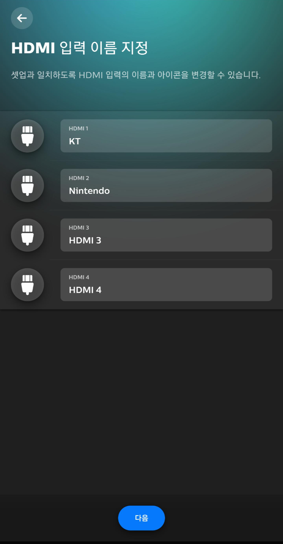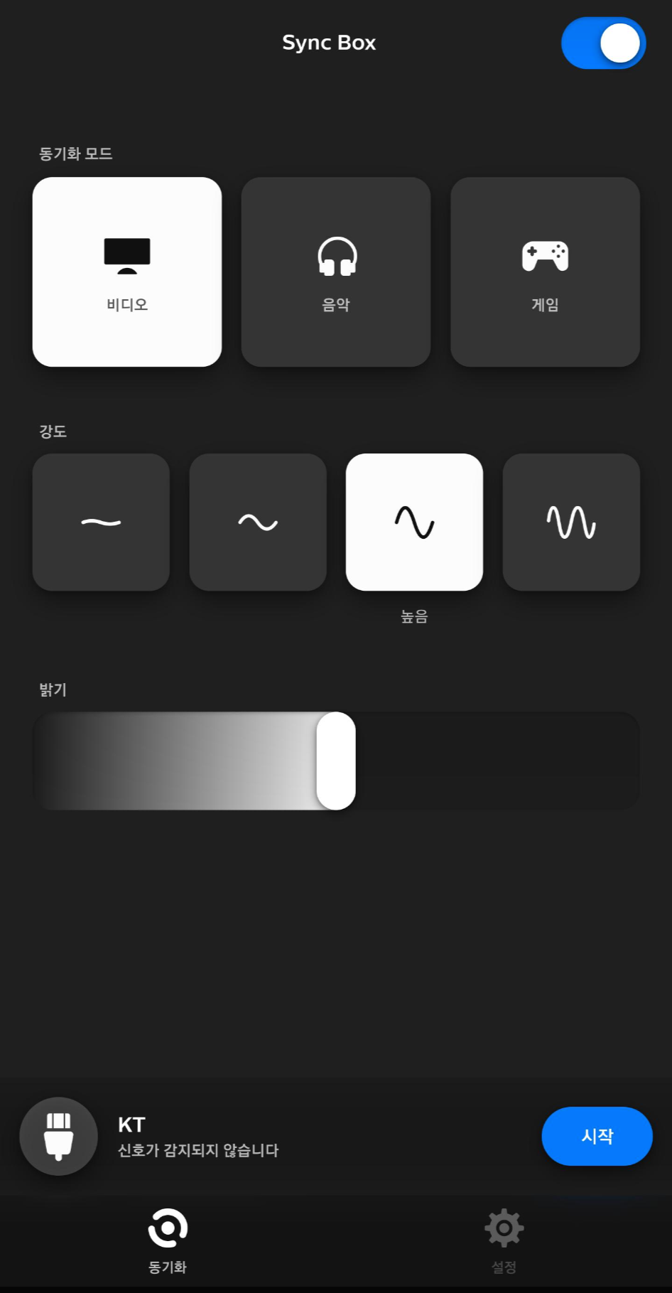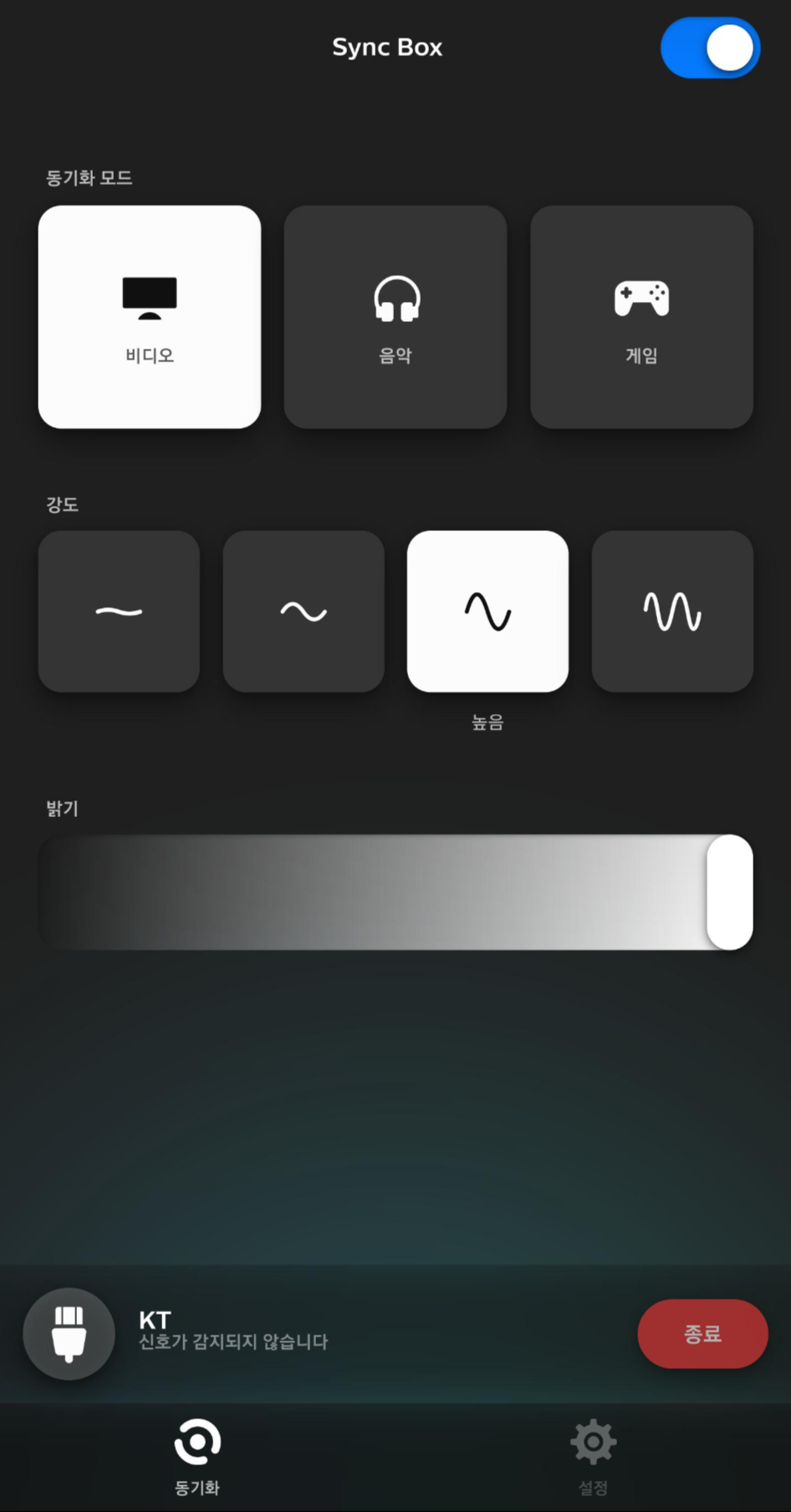 연결이 정상적으로 되었다면 현재 연결된 소스가 비디오, 음악, 게임 중 어떤 소스인지 그리고 변동 강도는 어떻게 할 건지 선택할 수 있습니다. 저희집의 경우 셋톱박스와 닌텐도 스위치만 연결이 되어 있습니다. 여기에 이제 플레이스테이션5 추가할 예정입니다.