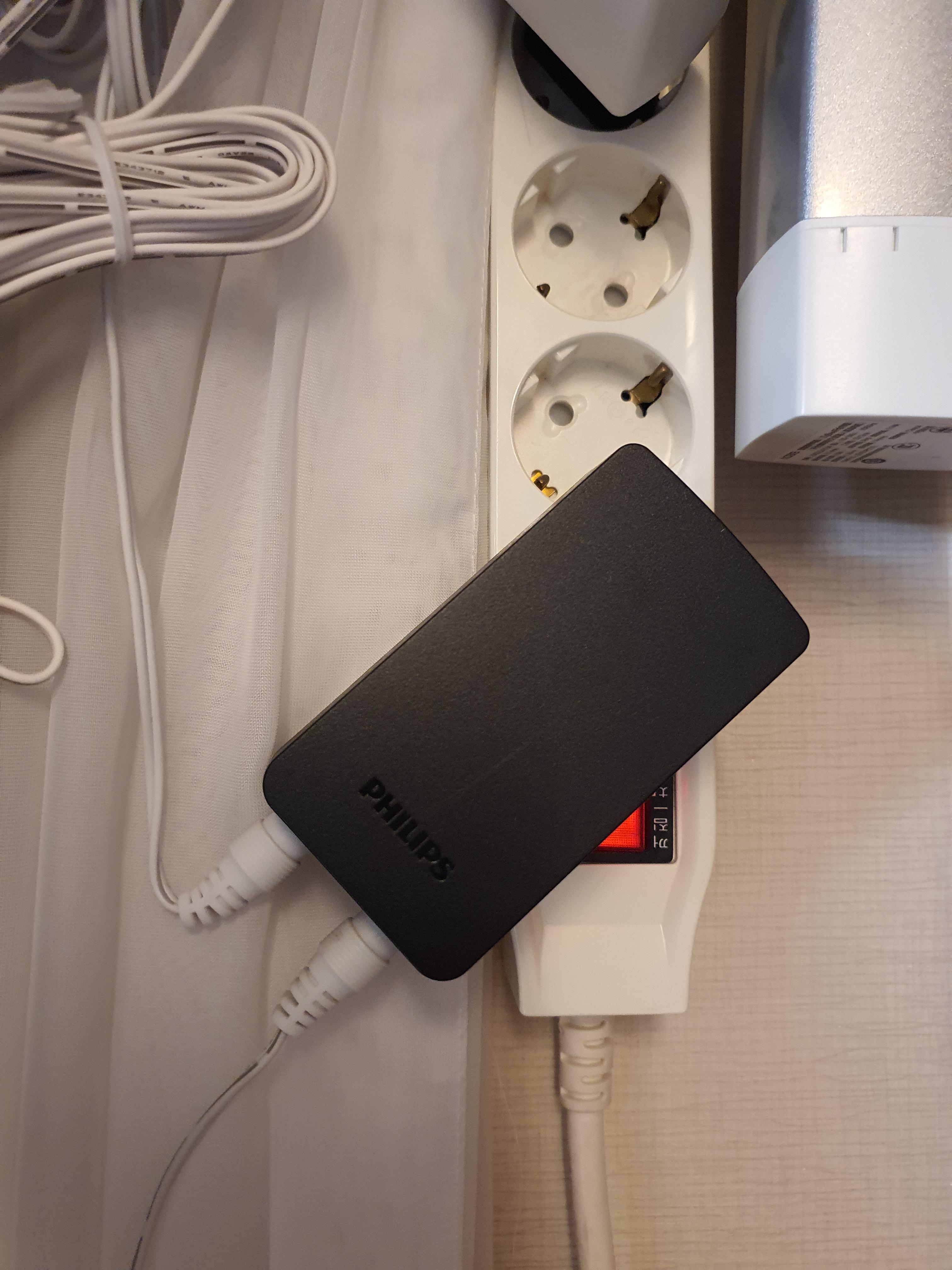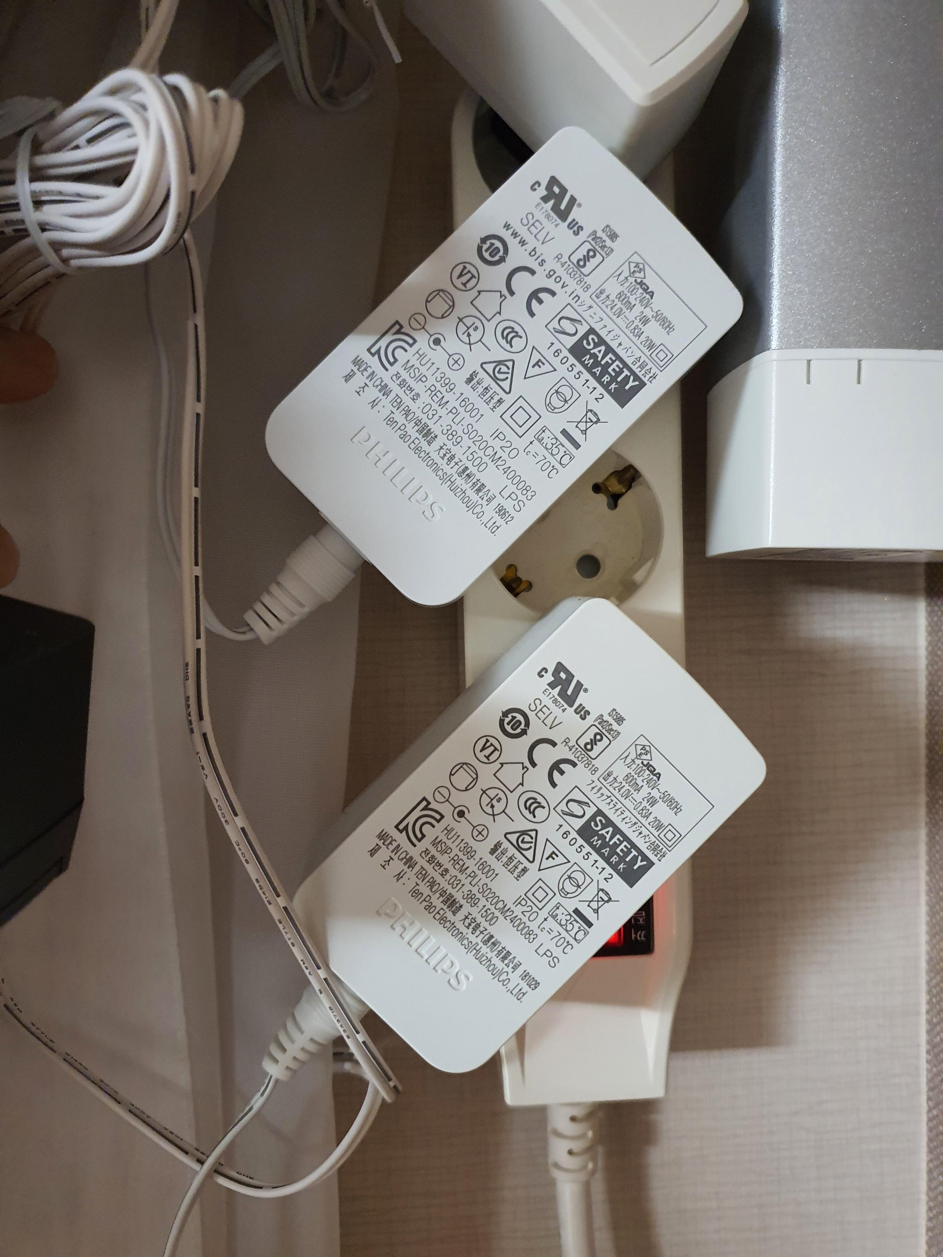 그리고 이 휴 플레이 바에 들어 있는 어답터는 홀이 3개이기 때문에 저희 집에 있는 스트립 두개를 여기에 연결했습니다. 어짜피 플레이바랑 싱크박스 어답터가 모두 3홀을 가지고 있기 때문에 플레이 바는 싱크박스와 함께 전원을 쓰면 되기 때문입니다. 개꿀입니다.