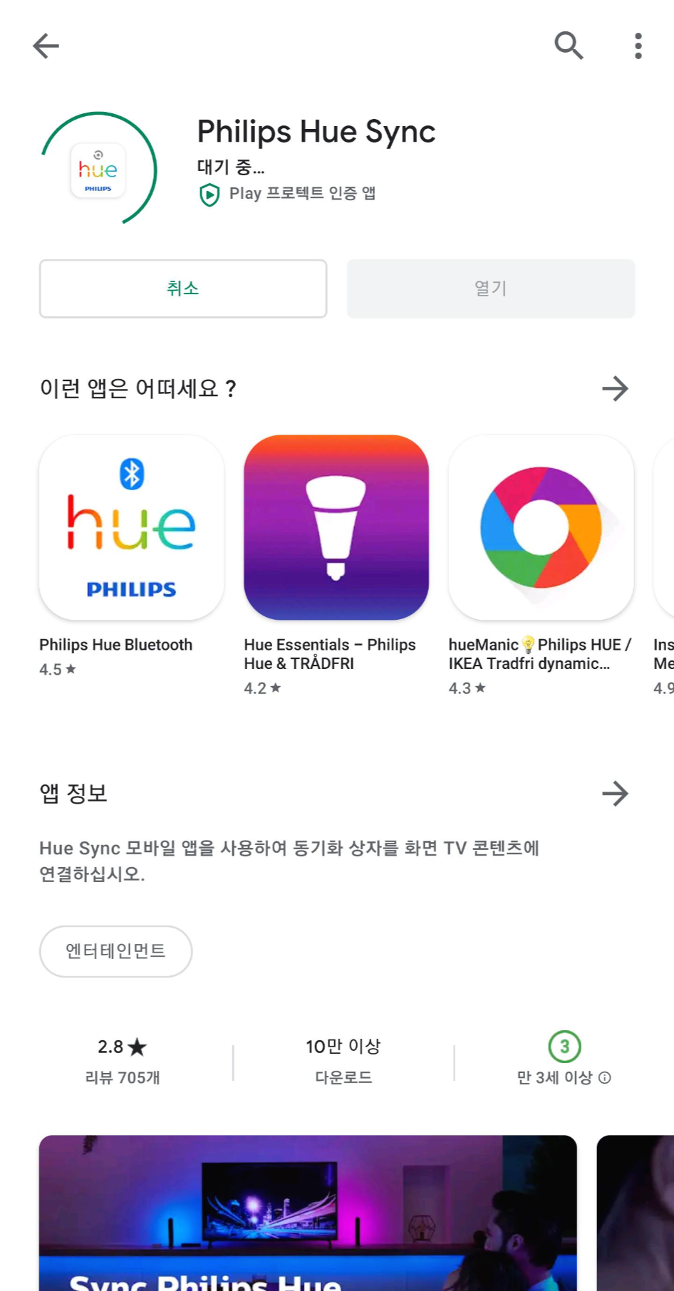 우선 애플 앱스토어 혹은 안드로이드 마켓에서 Philips Hue Sync 애플리케이션을 다운 받습니다. (링크) 브릿지를 설치하기 위해 다운 받으신 휴 플레이 앱과는 다르므로 꼭 추가 설치를 하셔야 합니다.