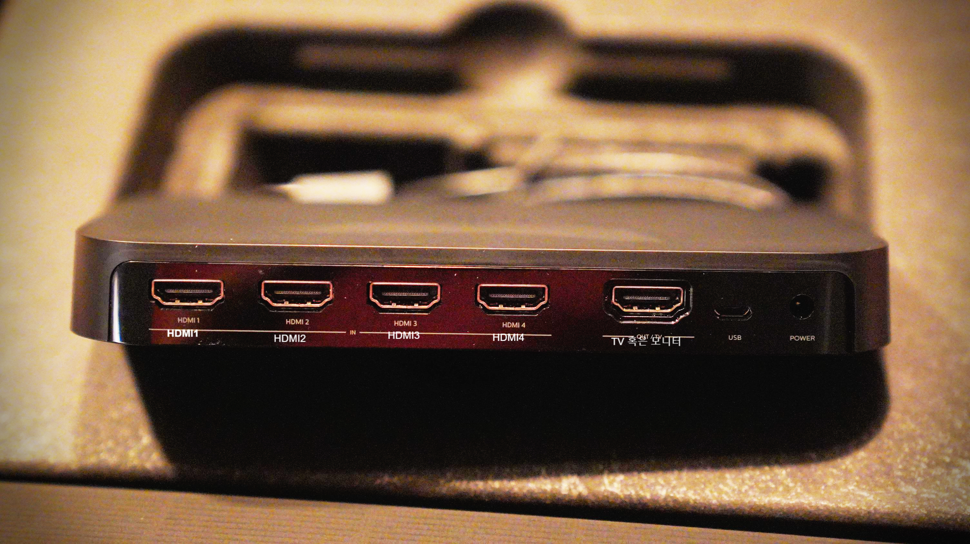 싱크박스 또한 설치가 매우 간단합니다. 가장 오른쪽에 전원 케이블을 연결하고 HDMI 1,2,3,4 포트에 내가 가진 디바이스들(셋톱박스, 게임기, PC) 등을 연결한 뒤, 맨 오른쪽의 HDMI 포트에는 TV나 모니터를 연결합니다. 여기에 Micro USB포트가 하나 있는데 이 경우 TV에 연결해 두시면 TV 전원의 켜짐, 꺼짐 여부에 따라 싱크박스의 연결도 동기화를 시켜둘 수 있습니다. TV 안보는데 굳이 싱크박스를 켜두어 전력을 소모할 필요가 없기 때문에 전력관리에도 굉장히 신경을 쓴 제품입니다.
