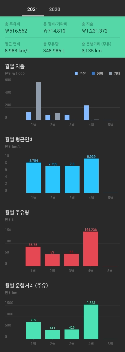신차이기 때문에 별 다른 유지비는 없고 모두 유류비나 세차비 입니다. 유지비는 이전 차량들에 비해 확실히 유류비는 많이 들어갑니다. 키로당 165원 정도 보시면 되겠습니다. (시내 60% 고속 40% 기준) 커뮤니티에서 연비 15~18 인증하시는 분들 있는데 이런 연비는 제가 많이 노력해 봤지만 절대 나오지 않고 많이 나와봤자 최대 9라고 보시면 되겠습니다. 저는 일반적인 운전 스타일이고 아이 있는 평범한 30대 직장인 입니다. 과속, 급가속, 급제동 하지 않는데도 이 정도인 것 보면 아마 운행을 즐기는 스타일이신 분들은 더 최악일 거라는 생각이 드네요. 역시 가솔린은 연비 생각하고 타서는 안된다는 것을 다시한번 느끼긴 하지만 아반떼 운행했을때랑 비교해보면 정말 연비가 좋지 않습니다. 아반떼는 그래도 14정도는 나왔던거 같아요. 그리고 한달 내내 시내주행만 한 월은 연비가 5.8~6 나옵니다. 정말 가솔린 구매하실 생각이시라면 연비는 생각하지 마세요. 많이 타는 달은 유류비로 못해도 20만원~30만원 지출한다고 보시면 됩니다.