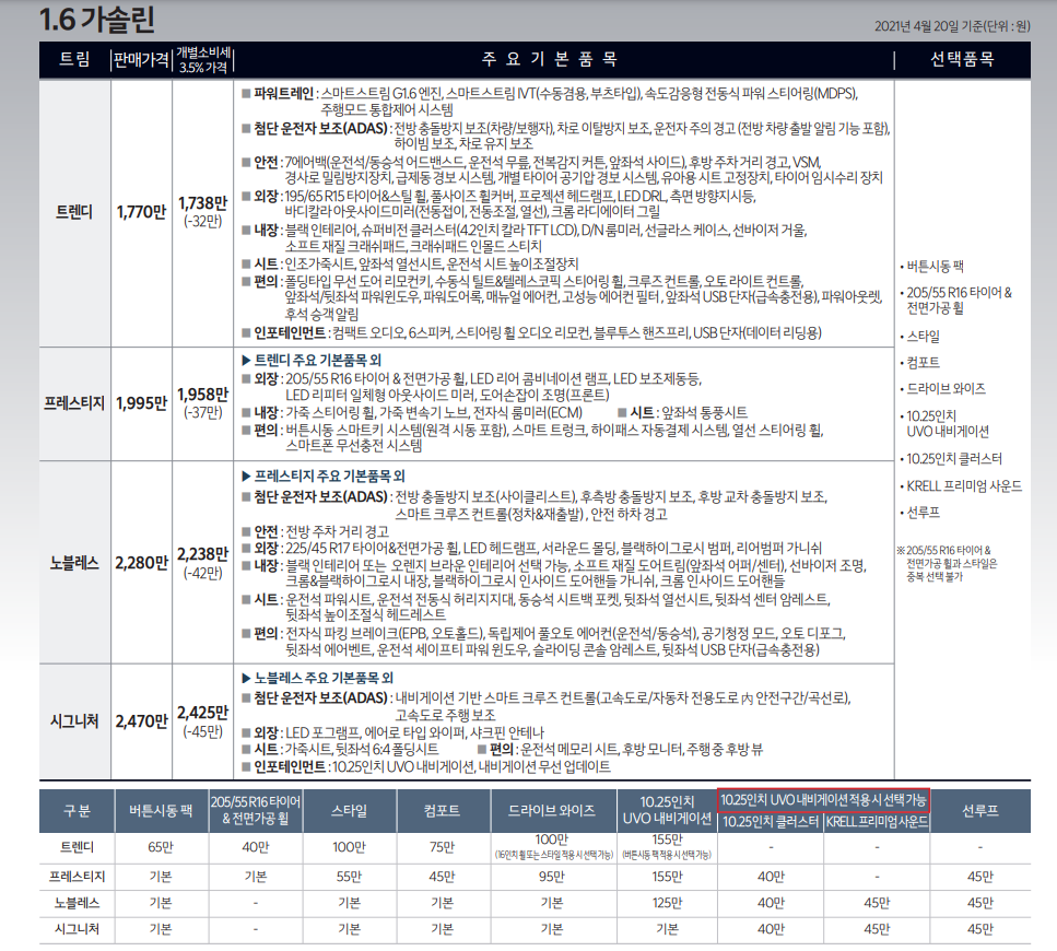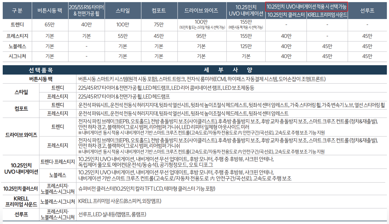 추천하는 등급인 프레스티지 기준으로 보겠습니다. 옵션 같은 경우 필요성, 기호성, 만족도, 가성비 등을 고려해서 그냥 저의 생각을 쓰는 것이라 공감하지 못하실 수도 있겠지만 저 나름 차량 구매를 여러번 해 보았고 운행해본 차량도 수십가지라 아무래도 제 의견이 차량 옵션 선택에 도움이 되실 거라고 생각합니다.