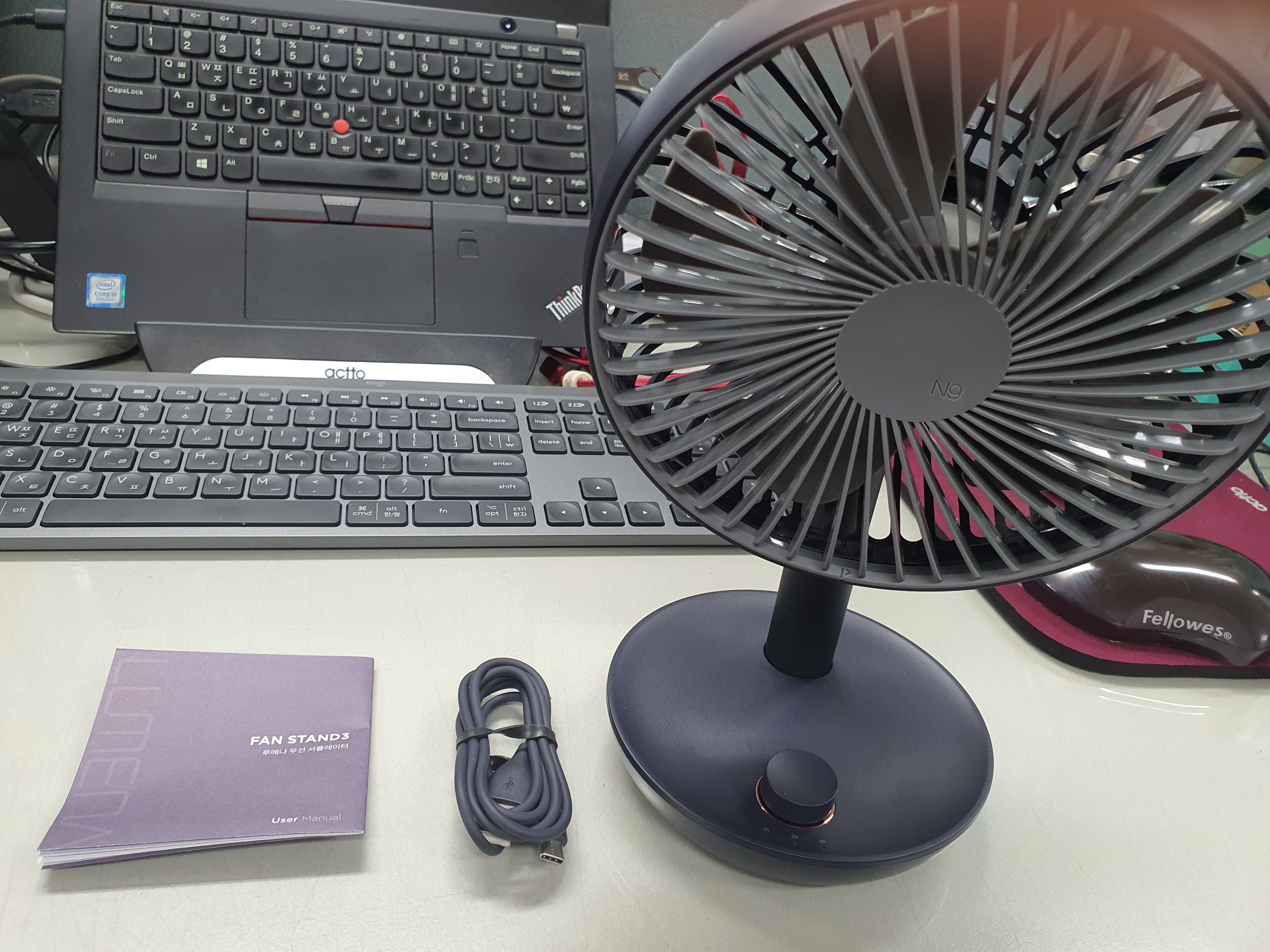 저는 처음에 세기 조절과 시간 조절만 할 수 있다고 생각했는데 조그 다이얼을 몇초 이상 누르고 있으면 회전도 됩니다. 그리고 아무래도 삼실에 있다보면 선풍기 끄고 가는걸 잊어버릴때가 많아 매일 지적 받았는데 타이머 기능이 있어서 잘된일 같습니다. 세기는 아래 보이는 조그 다이얼을 돌리면 되고, 타이머 설정은 이 조그다이얼을 누르면 됩니다. 그리고 충전중에는 아래와 같이 LED 인디케이터에 불이 들어옵니다.