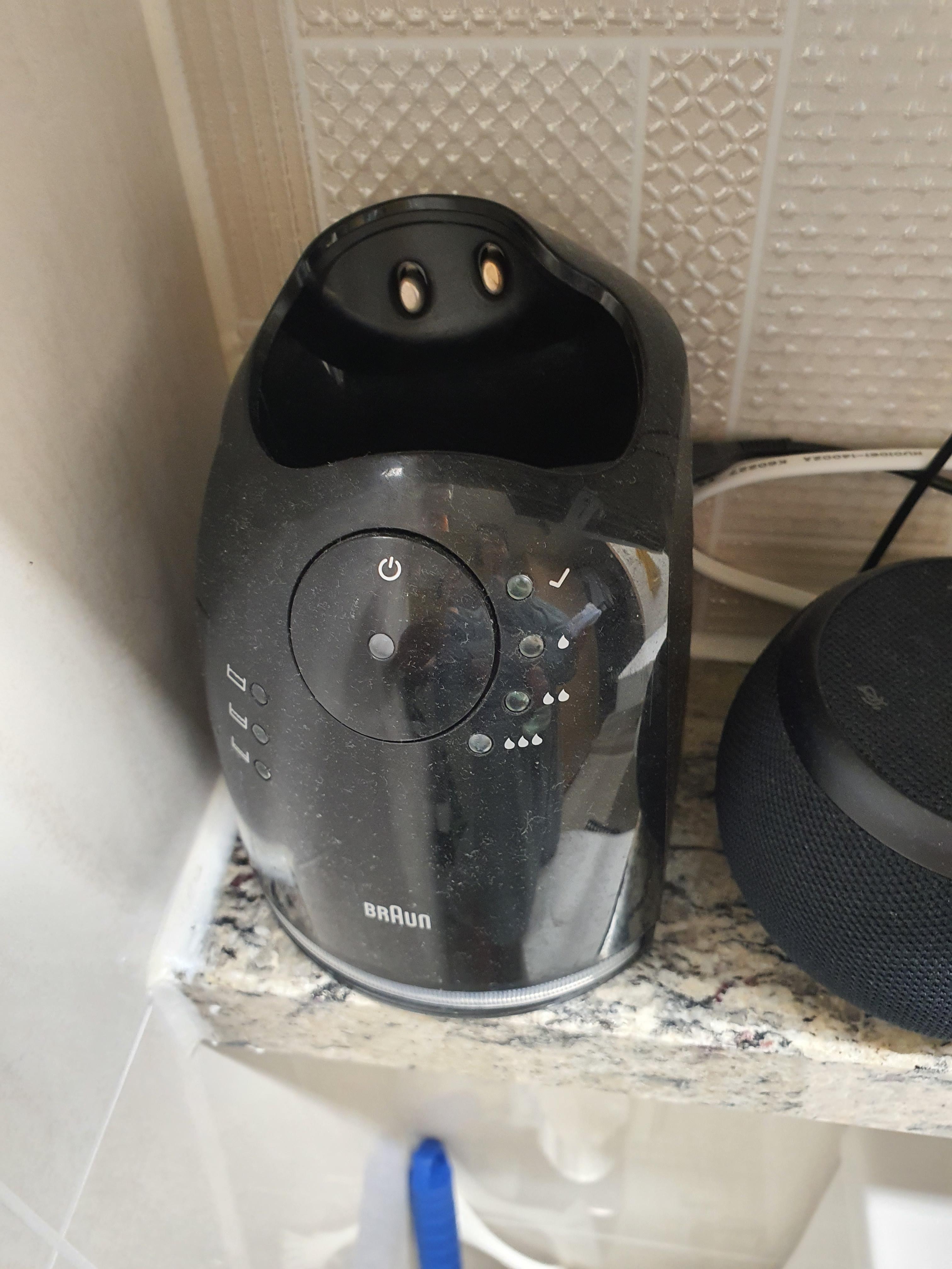 충전독에 넣으면 왼쪽에는 세정액의 수위가 표시되고 오른쪽에는 면도기의 오염 정도가 표시됩니다. 맨 하단이 가장 오염이 큰 것이고 가장 위가 오염도가 적은 것입니다.
