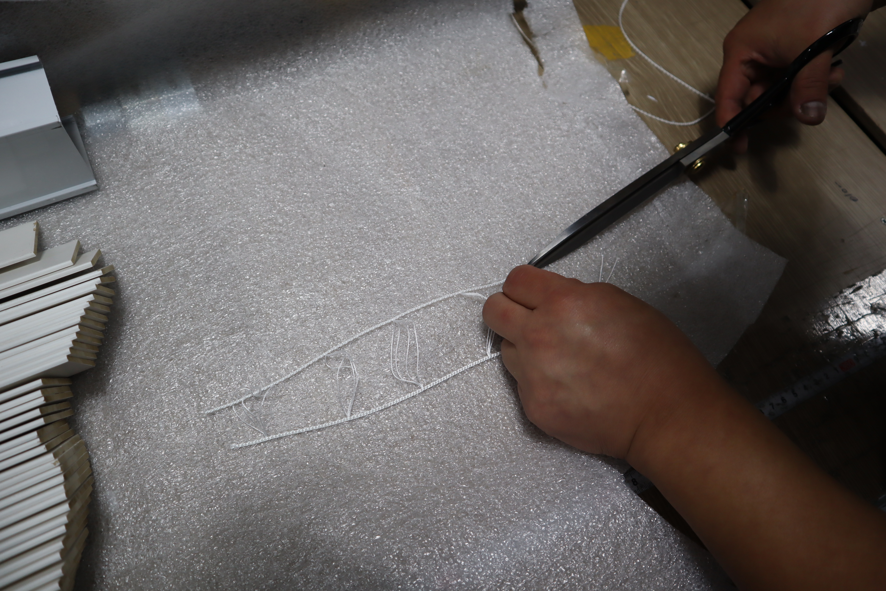 그 다음에 이제 실의 길이를 맞춰주는 작업인거 같은데 사실 이게 제가 이 작업을 그냥 윈테리어에 맡긴 이유입니다. 실에 길이를 맞춘다음에 펜으로 표시를 하네요. 일단 우선적으로 실은 길이가 다 같다는 가정하에 같은 자리에 표시를 한 후, 나중에 매듭등을 통해서 수평을 맞추는 작업이 아닐까 싶네요.
