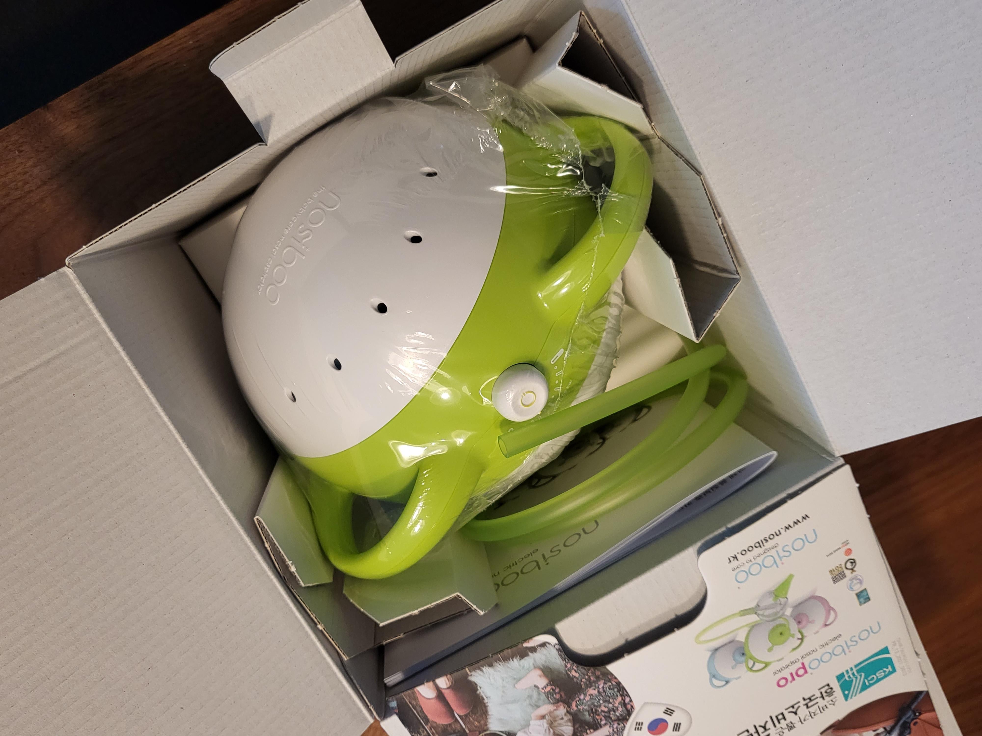 사용법은 굉장히 간단합니다. 노즐을 기계에 꽂고, 반대쪽에는 코에 넣는 모듈을 꽂으면 완료됩니다. 이제 제품을 켜고 아기 코에 넣기만 하면 됩니다. 참고로 기계 가동 후 10초 후에 사용하라고 되어 있습니다.