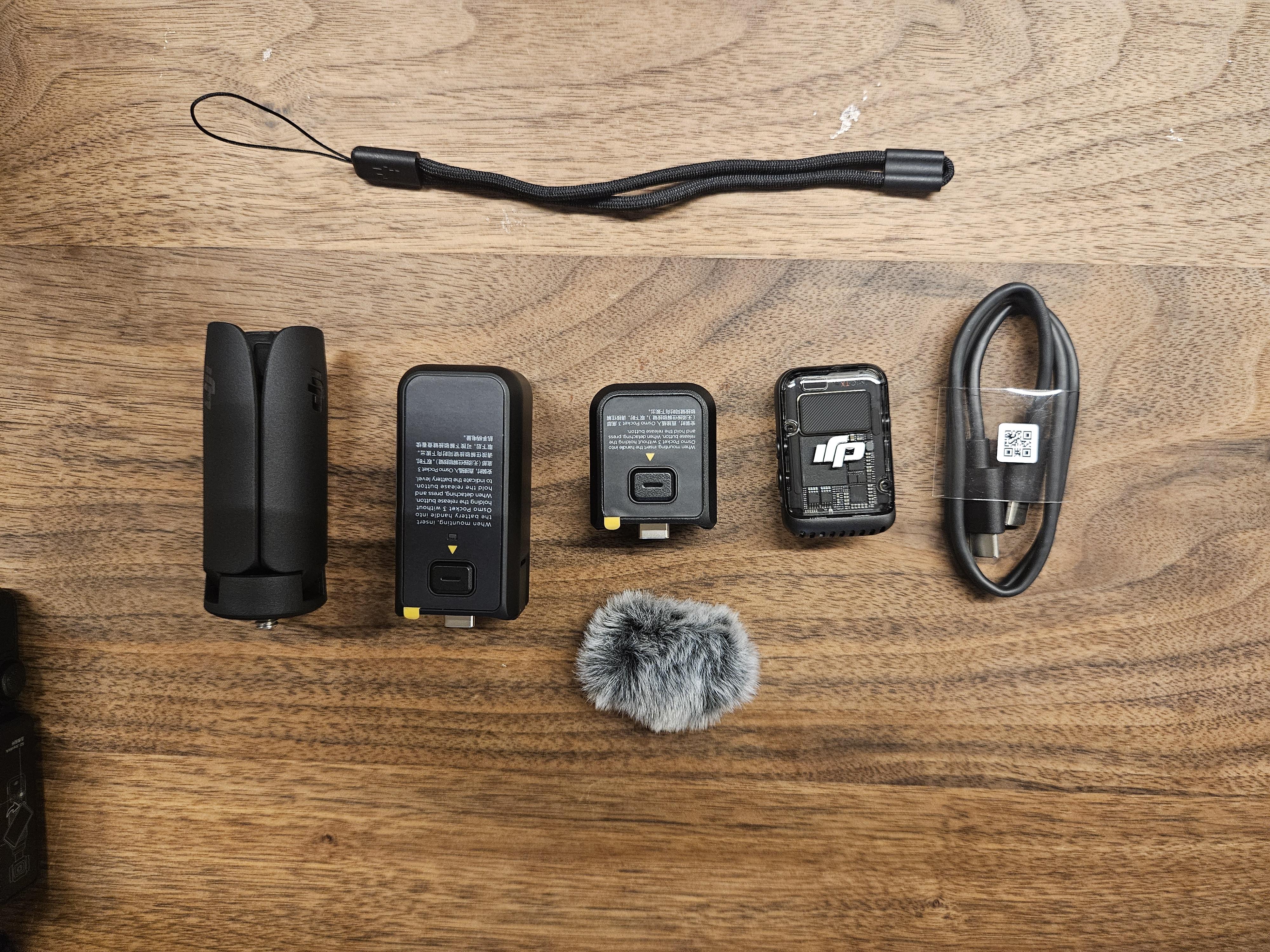 좌측부터 삼각대, 보조배터리, 삼각대 체결을 위한 보조 거치대, 마이크, USB 케이블 등등