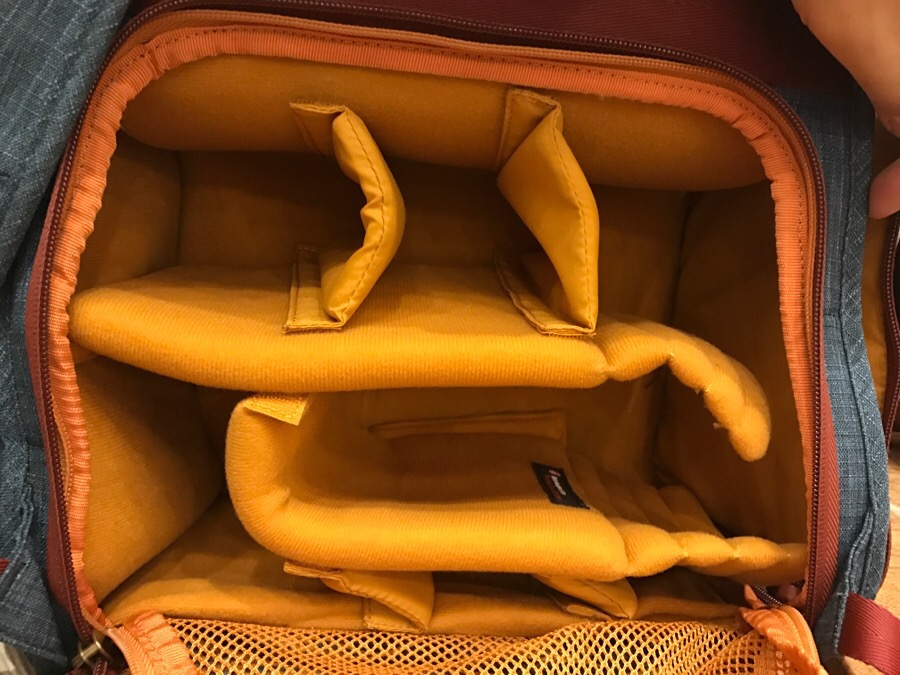이렇게 카메라 수납공간이 나옵니다. 퀵포켓이죠. 이 부분은 사람이 선 상태에서 뭔가 꺼내야 하기 때문에 각도가 굉장히 중요합니다. 이 각도를 적절히 활용하기 위해서는 너무 가방끈을 타이트하게 조이시지 않는게 좋습니다. 어쨋든 카메라1개 2470정도 크기의 렌즈 2개를 적재할 수있는공간이 자리잡고 있습니다. 사실 이 퀵포켓에 렌즈를 하나 이상 넣는것은 추천드리지 않습니다. 한 렌즈는 손으로 잡는다 하더라도, 렌즈 무게 때문에 나머지 렌즈가 가방에서 추락할 가능성이 크기때문에 서서 교환하는건 왠만해선 추천하지 않습니다.